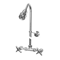 Economical, yet ruggedly constructed for outdoor installations. Wall mount. Chrome plated brass. Adjustable low flow shower head. 6" adjustable wall bracket. Cross handles. 24" riser. 1/2" IPS Female inlets.